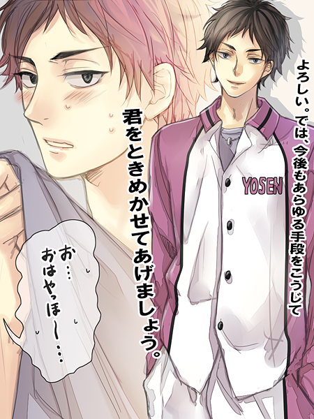 画像は前に「一番目にリプきたキャラに二番目にリプきたキャラの服を着せて三番目にリプきたキャラの台詞を言ってもらう」ってタグで遊んでもらったモノで、赤葦に氷室の服を着せてトキヤのセリフを言ってもらいました。